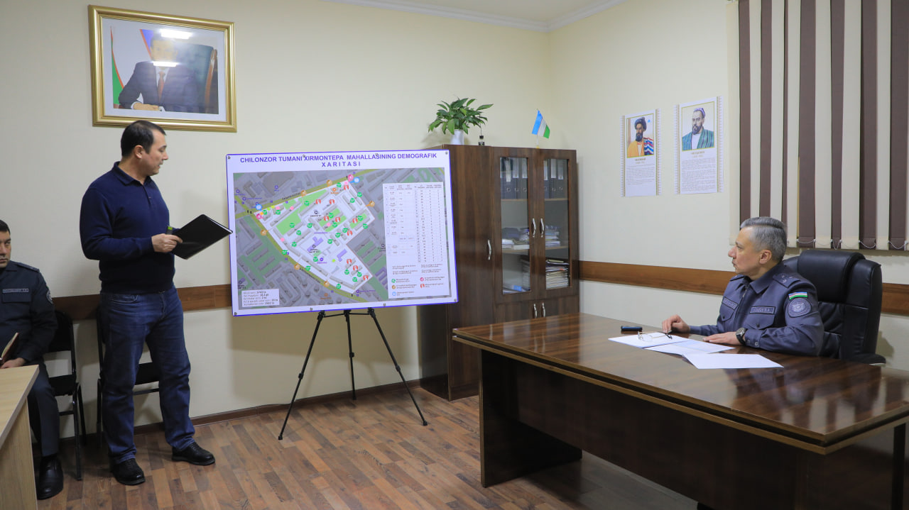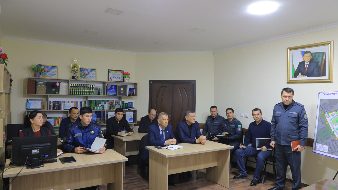 Ўрганишлар “Тирсакобод” маҳалласидан бошланди. Масъуллар ва “маҳалла еттилиги” ходимлари билан бўлган йиғилишда жамоат хавфсизлигини таъминлаш, жиноятчиликни жиловлаш, аҳоли муаммоларини ўрганиш, мурожаатлар билан ишлаш борасида кўрилаётган чора-тадбирлар муҳокама қилинди.