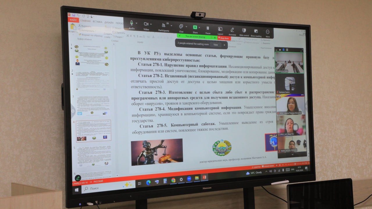 Onlayn muloqot tarzida o‘tgan mashg‘ulotda ishtirokchilar raqamli texnologiyalar va sun’iy intellekt yordamida sodir etilayotgan jinoyatlar, ularni tergov qilishning protsessual xususiyatlari, bu borada yuzaga kelayotgan ayrim muammolar, rivojlangan mamlakatlarda yo‘lga qo‘yilgan ilg‘or tajribalar, ta’lim jarayoniga tatbiq etilishi zarur bo‘lgan yondashuvlar haqida fikr almashdilar.