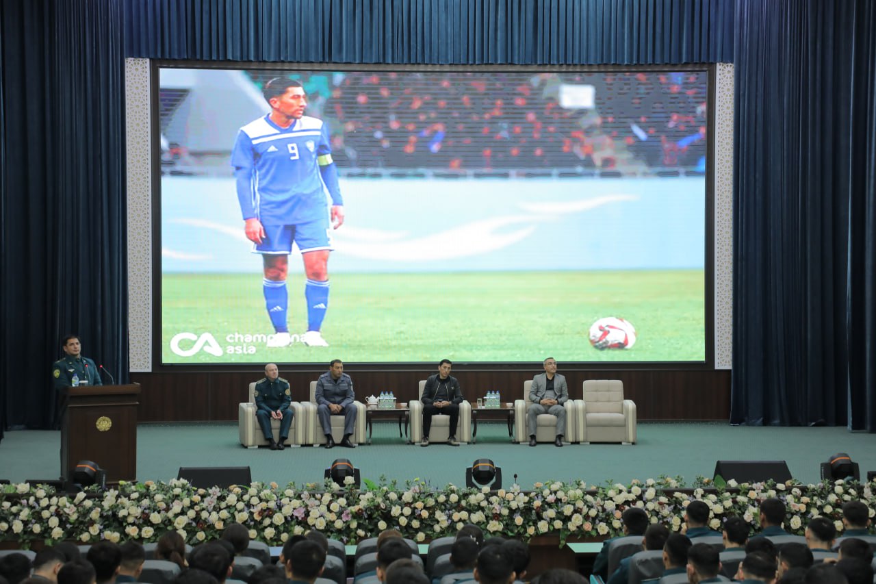 Sportchi kursantlar bilan uchrashuv chog‘ida o’zining futbol olamida bosib o’tgan zalvorli yo’li, faoliyati davomidagi turli xil to’siqlar va qiyinchiliklar bilan birga yerishgan yutuqlari to’g‘risida so’zlab berdi.
