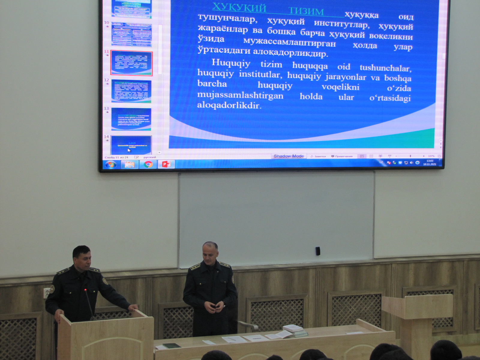 IIV Malaka oshirish instituti dotsenti M.Suvonqulov “Huquq tizimi va huquqiy tizim tushunchasi. Qonunchilikni tizimlashtirish” mavzusiga to‘xtaldi. Ichki ishlar organlarining norma ijodkorligi faoliyati va huquqni qo‘llash amaliyoti holati yuzasidan bildirilgan mulohazalar, sohadagi mavjud muammolar tahlili mashg‘ulot samaradorligini oshirdi. Kursantlar o‘zlarini qiziqtirgan savollarga atroflicha javob olishdi.